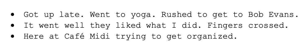 One day, I was there at a very busy time after a commercial audition for Bob Evan’s Restaurants, an American food chain. I hadn’t been sitting there long, so I was in the first phase of writing a recap of my day, where sentences were short and to the point.