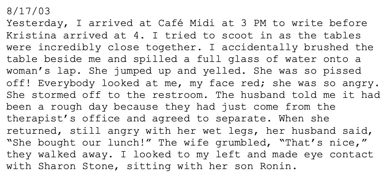 I’ve kept a journal since the 5th grade. I work out first and then go to a cafe to write. My first writing spot was The Dipsea Cafe in Mill Valley, California. I would order iced tea, eat a pancake, write in my journal, see George Lucas eating alone, and then drive into San Francisco to work at The Bay Club.