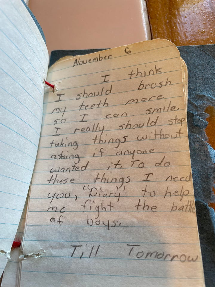 I started with my 5th-grade handmade journal titled “My Secret Book.”